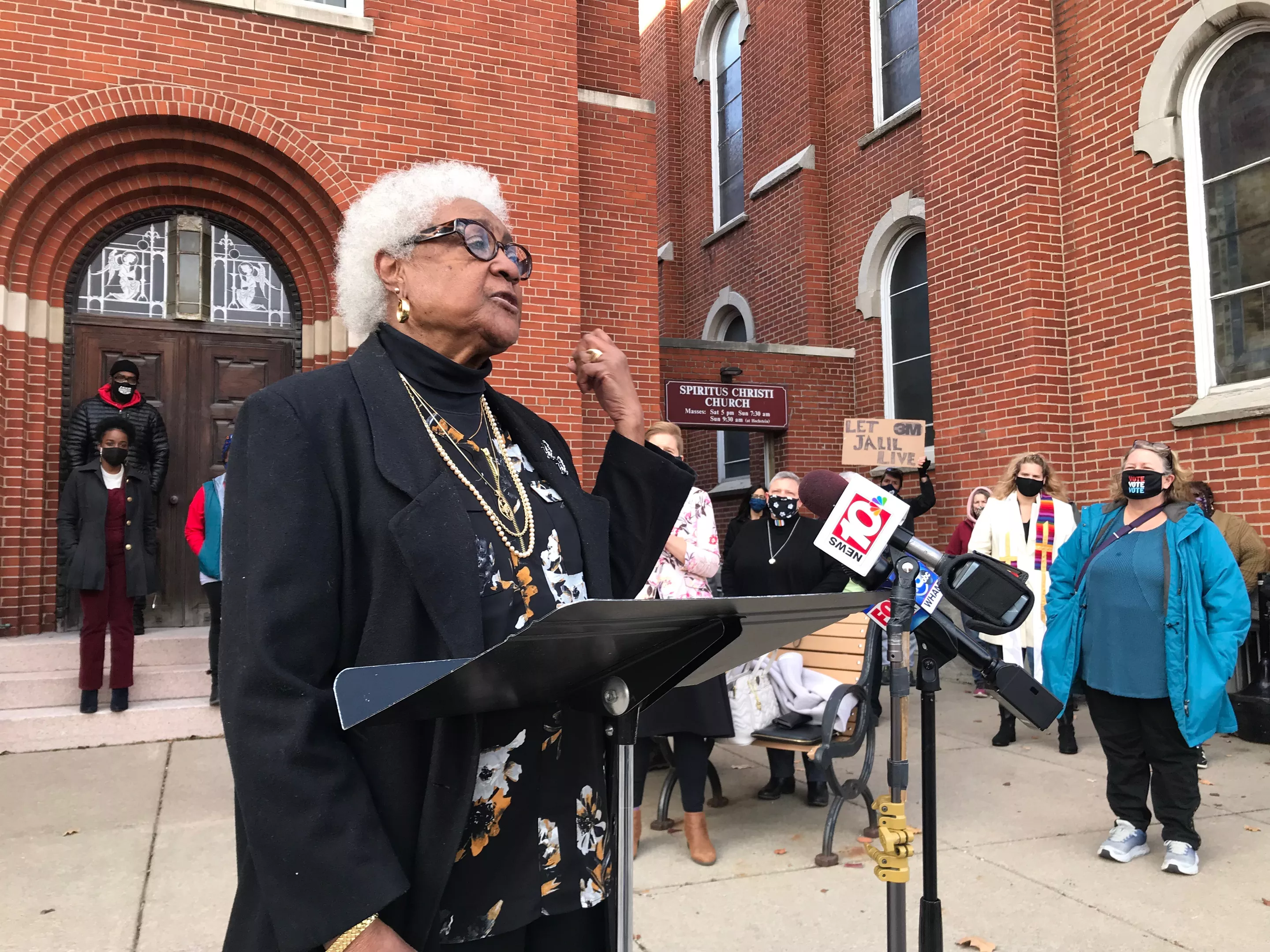 Billie Bottom Brown, 85, the mother of Jalil Abdul Muntaqim, aka Anthony Bottom, speaks outside of Spiritus Christi Church on behalf of her son on Nov. 12, 2020.
